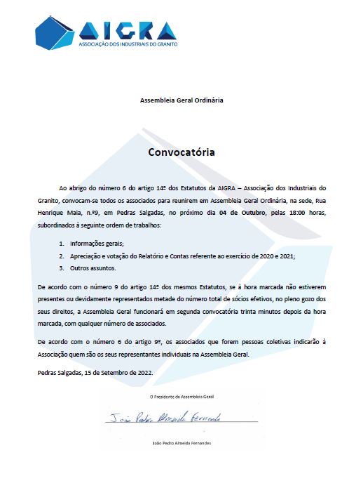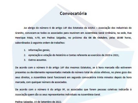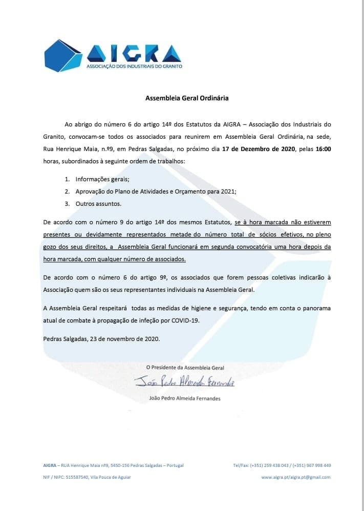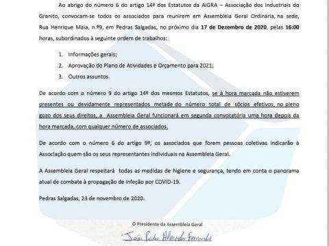 Prezados Sócios, a AIGRA – Associação dos Industriais do Granito dando cumprimento ao previsto nos seus estatutos irá, no dia 17 de Dezembro de 2020, pelas […]
